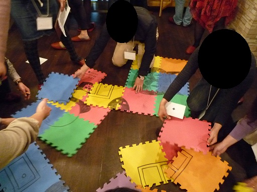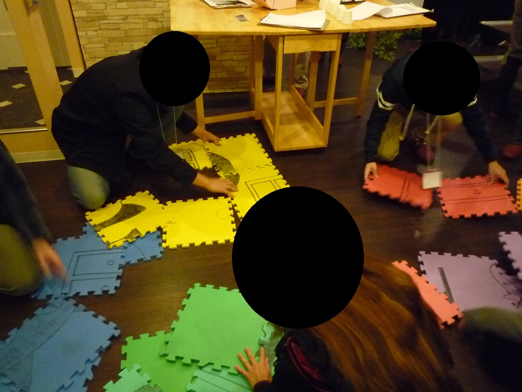 まず、2頁目にあるように3人が緑ボードを三角形で囲むように立ち、