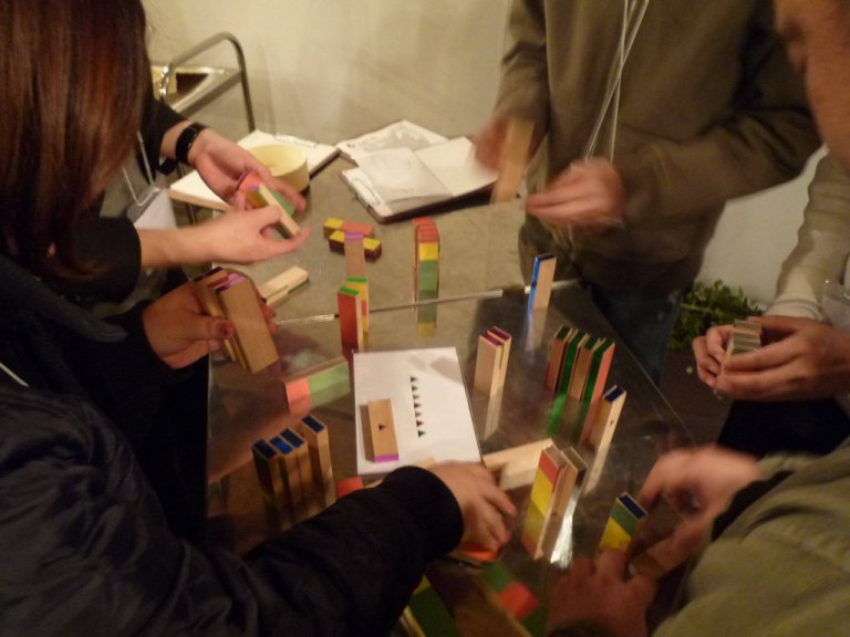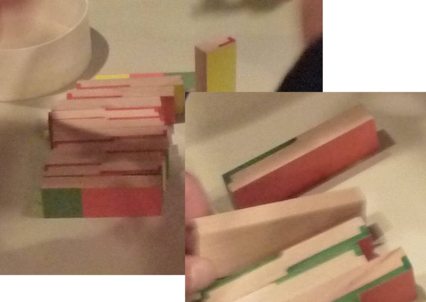 木片の側面に三角形パネルと同じキラキラ色が付いているものを色で仕分けると、