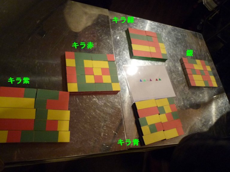 これをキラ色のパネルに順(青緑銀紫銀赤緑)に読んでいくと、