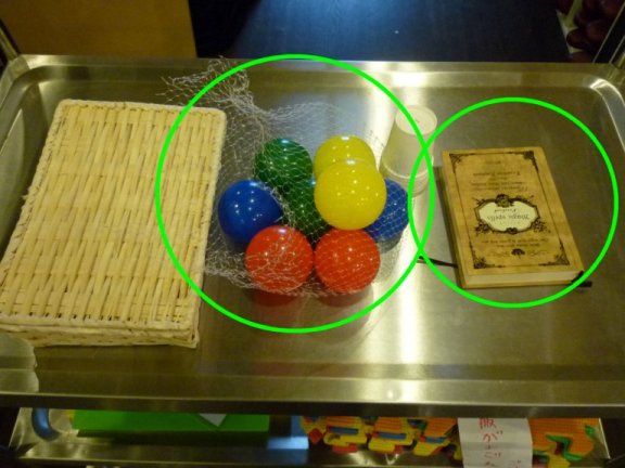 例えば、1行目であれば、三角形の上の人が置いてある緑のボールを取るということです。