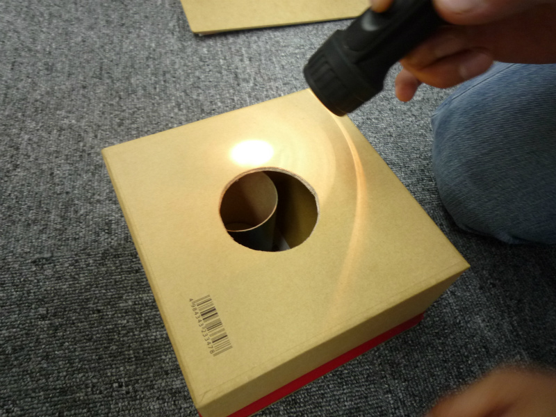 賞状入れのふたを穴から入れ、鏡に映った文字を読んでいきます。