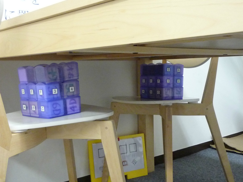 キューブには、「ひらがなの文字」や「片仮名の文字」そして緑色と紫色で1Aや2Fといった「置き場所の指定」などがそれぞれの面に書いてあります。