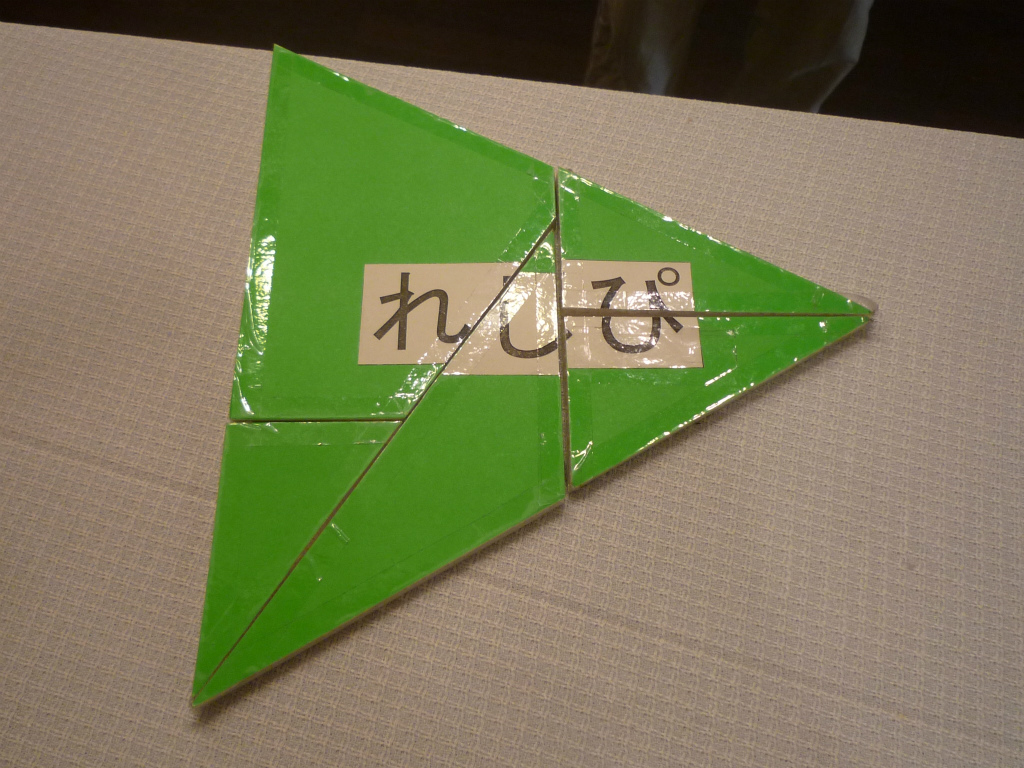 プレートを三角形に並べると「れしぴ」と読めます。