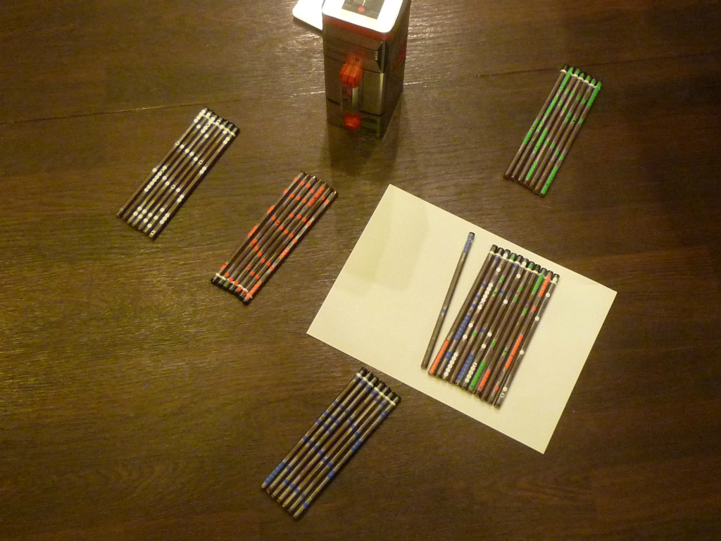 六角形の1面に赤、青、緑、白のカラーシールが貼られており、