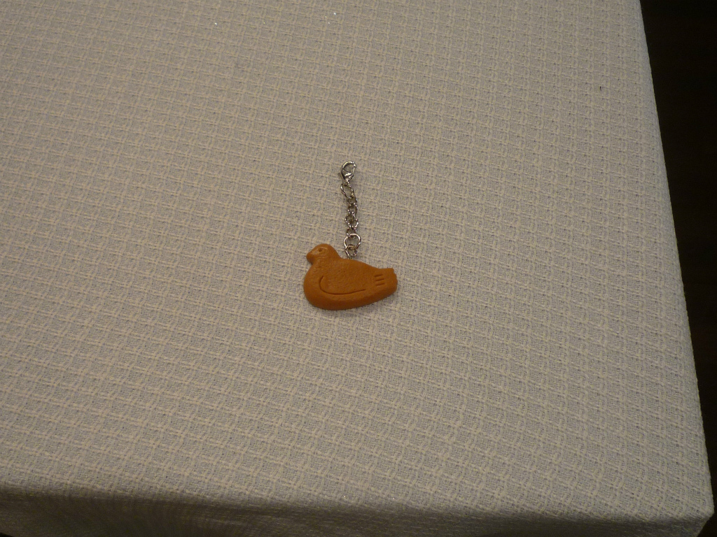 【PEACE】シールが貼られた鳩三郎キーホルダーを発見ます。