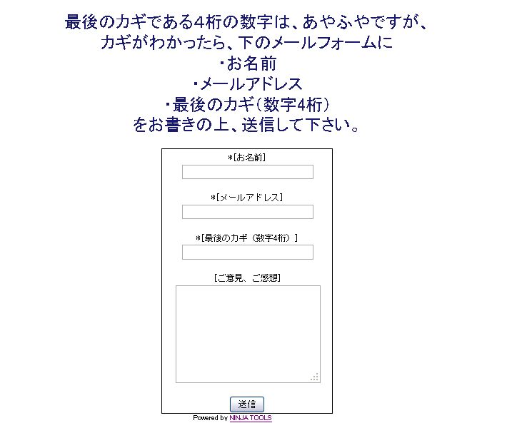 というわけで、メールフォームから最後の鍵を「3727」とお送りいただいた方が正解でした!